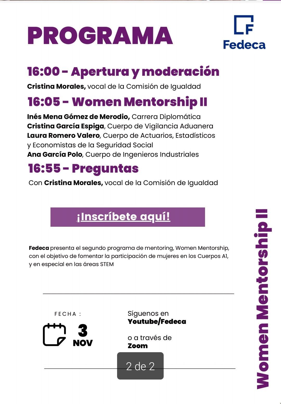 Este 3 de noviembre, nuestra compañera Inés Mena presentó la Carrera Diplomática en el Women Mentorship II, organizado Comisión de Igualdad de FEDECA (Federación de Asociaciones de los Cuerpos Superiores de la Administración Civil del Estado).